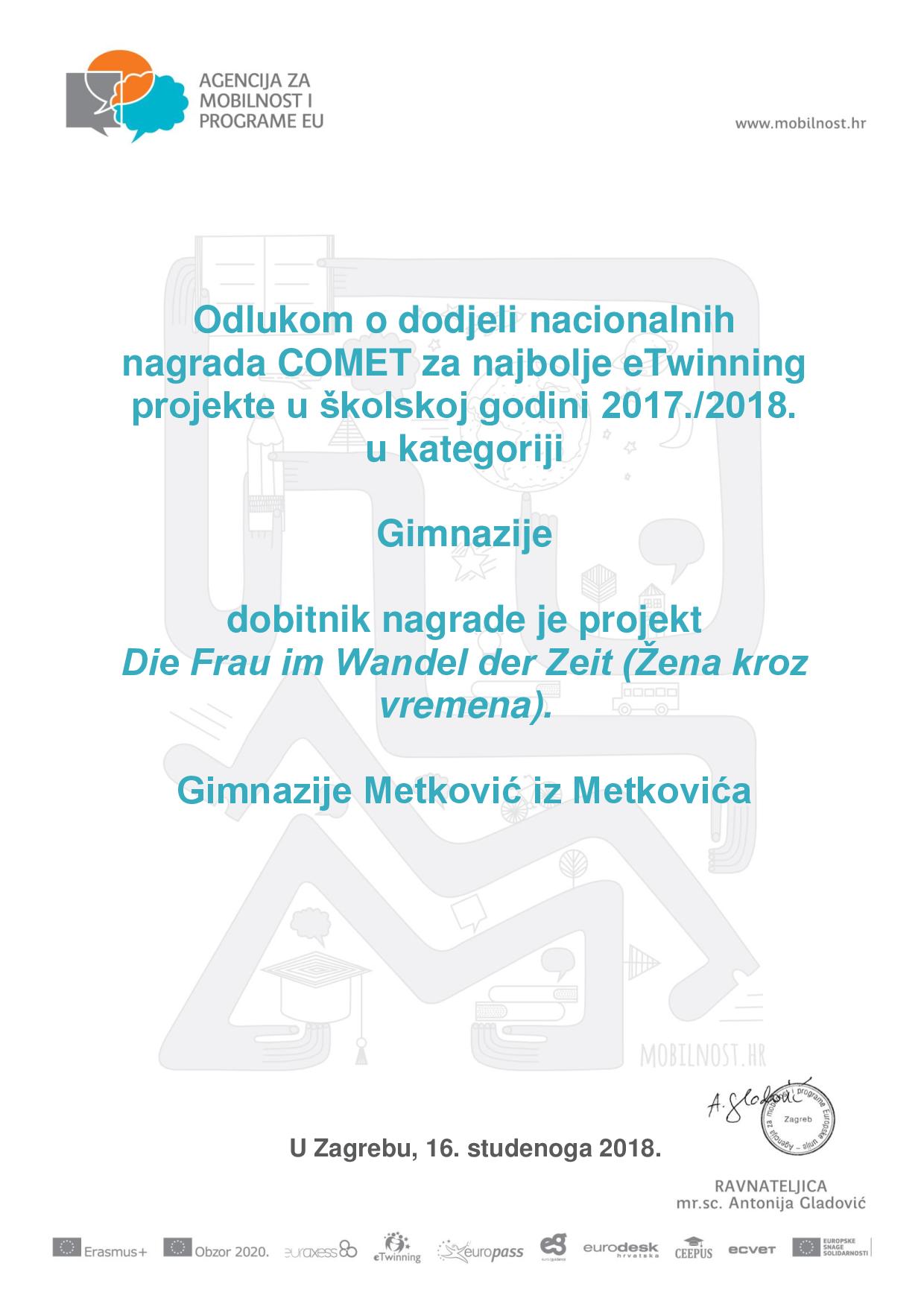 Riječ je nacionalnoj nagradi COMET, koja se dodjeljuje za najbolje eTwinning projekte u protekloj školskoj godini, a pored ovog priznanja, projekt je nagrađen i Nacionalnom i Europskom oznakom kvalitete.