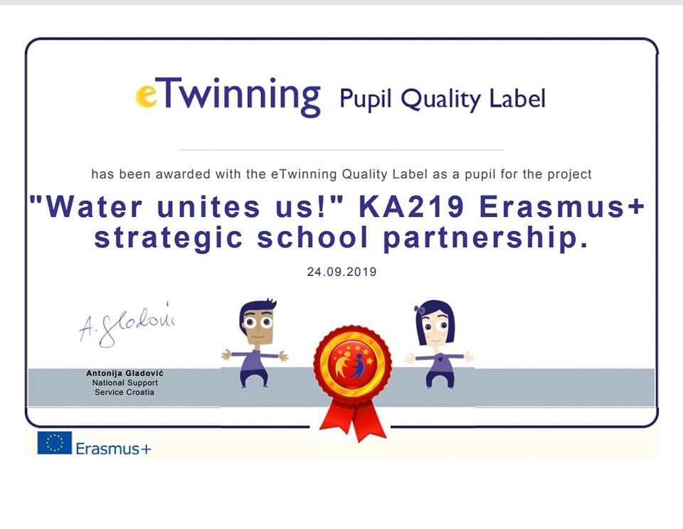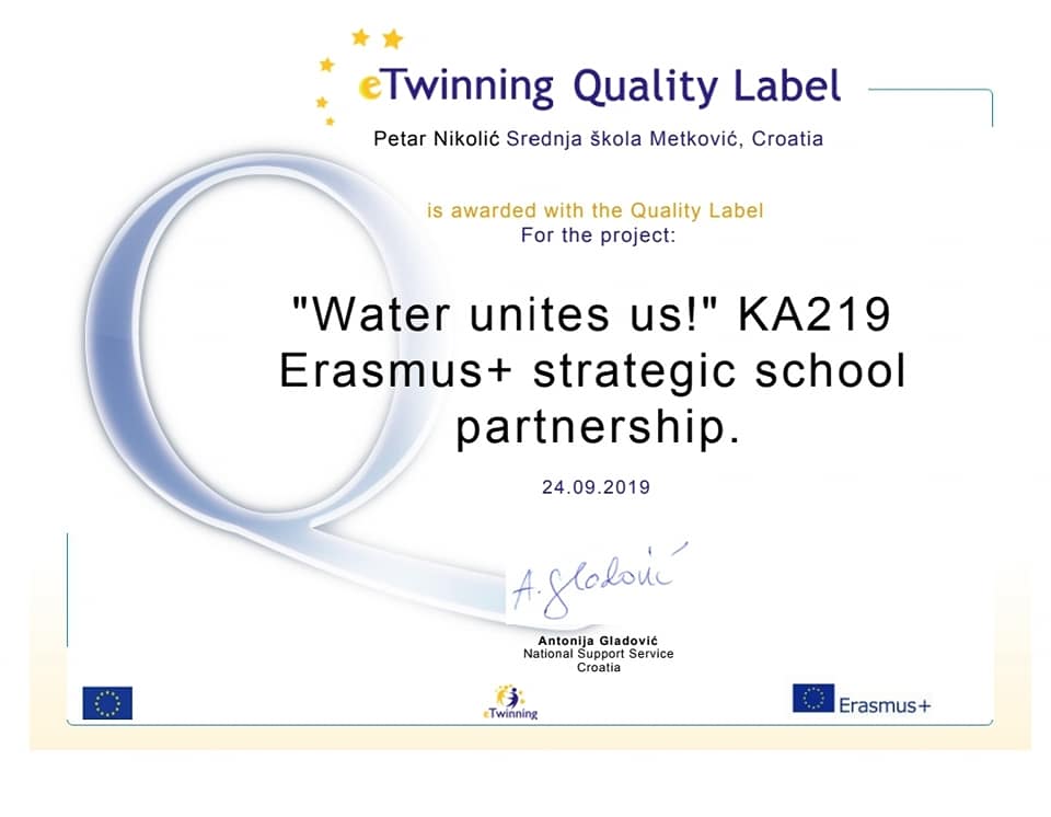 Agencija za mobilnost i programe Europske unije dodijelila je profesoru Petru Nikoliću i Srednjoj školi Metković eTwinning oznaku kvalitete za Erasmus+ projekt „Water unites us”.