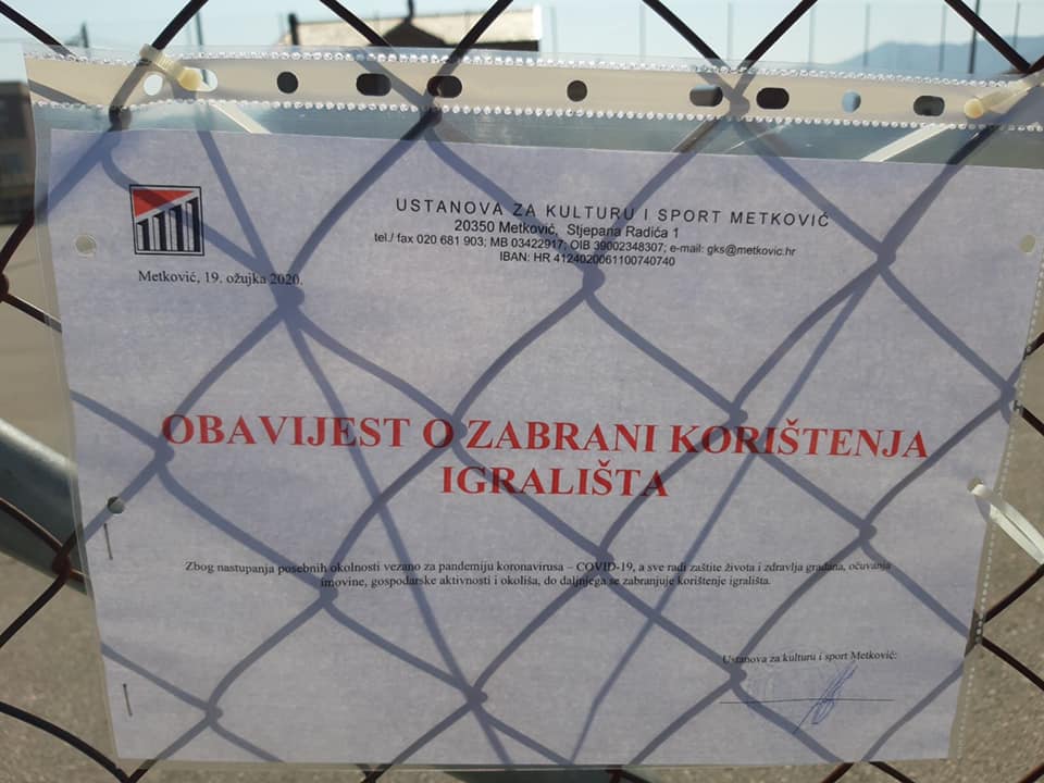 Sukladno obavijesti Stožera civilne zaštite Republike Hrvatske, Grad Metković će zatvoriti i ograditi sva dječja i sportska igrališta.